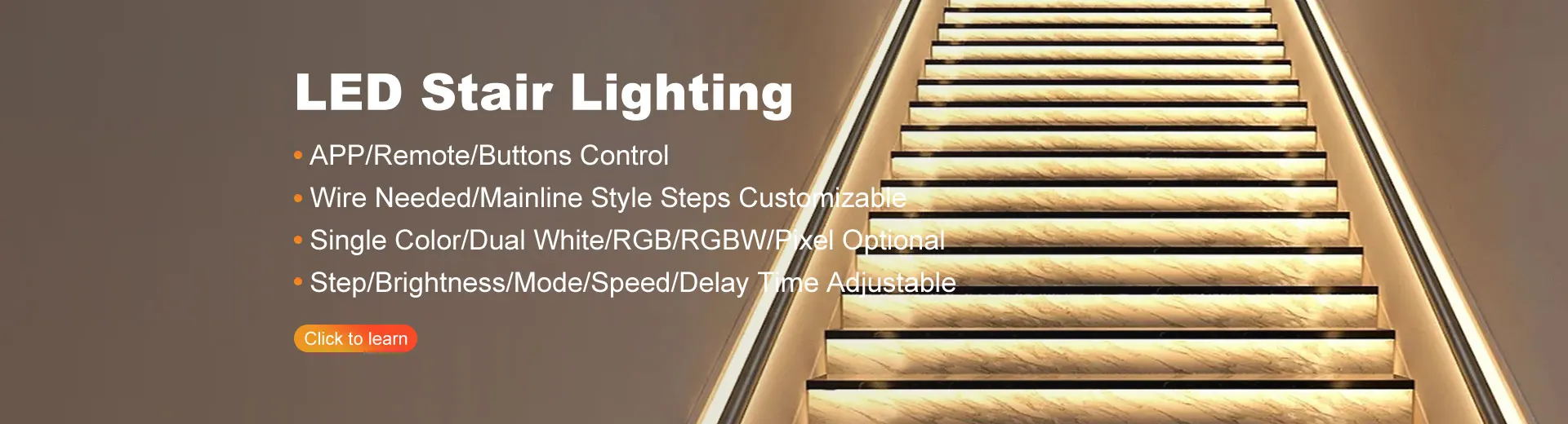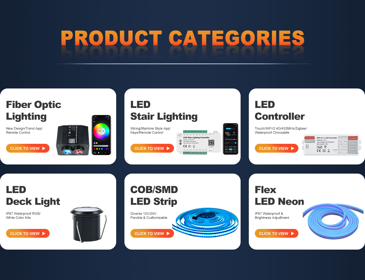 Productos principales:Iluminación LED para escaleras, tira LED COB, neón LED flexible, controlador LED, iluminación de fibra óptica