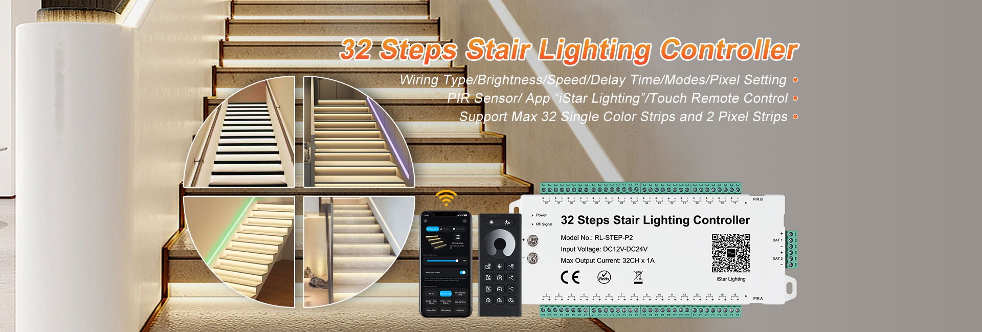 Controlador Fácil de Instalar para Escalera, Iluminación Dinámica Opcional DE UN Solo Color y Tira de Píxeles, 16-32 Pasos, DC12V 24V