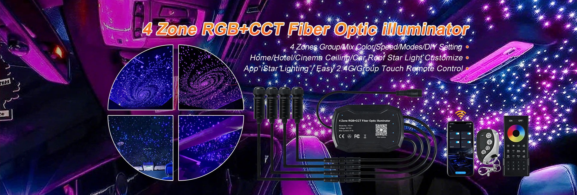 Iluminador de fibra óptica RGB + CCT de 4 zonas, multimodo, DC12V, 4 * 1A, fuente de iluminación de Control RF/App para proyectos de luz de techo